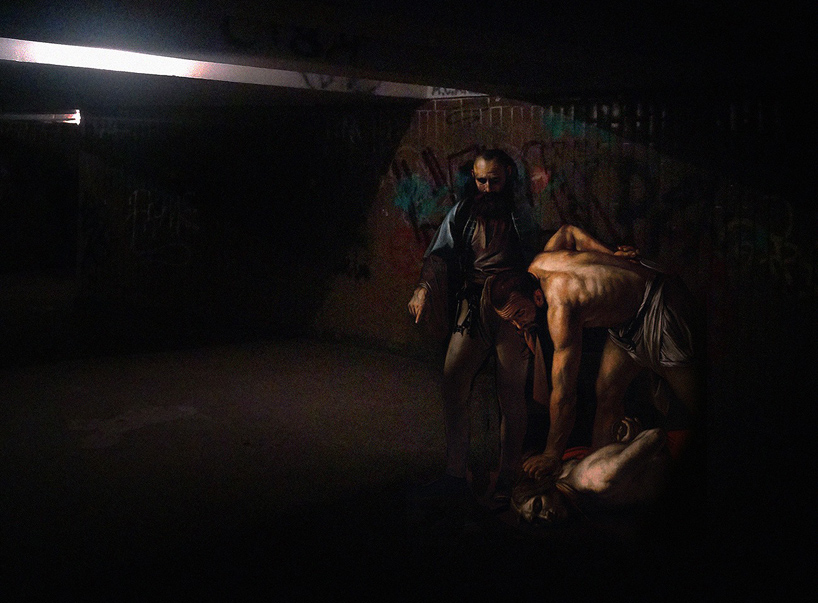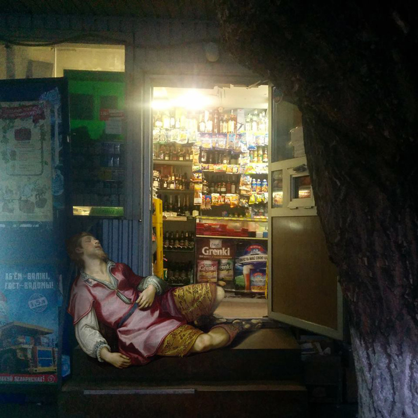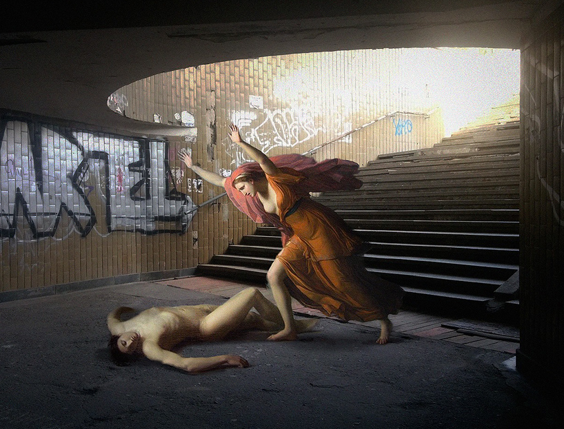 For his ongoing series “Art History in Contemporary Life,” Ukrainian artist Alexey Kondakov takes scenes and figures lifted from classical paintings and drops them into modern-day life. I really like his approach and his fine ideas, paired with feeling for the light situation.