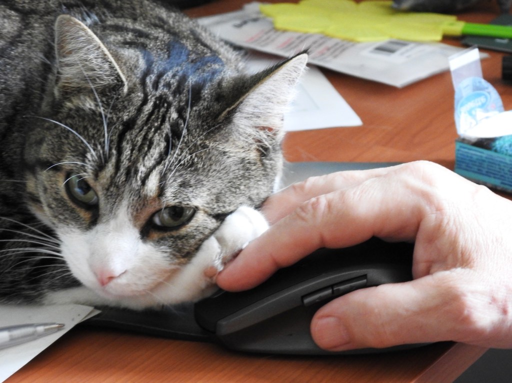 Our little cat Lilly likes to squat out in front of sweetheart’s computer screen. It is nice and warm there. Plus she is near to him. What she doesn’t like, however, is him clicking away at his mouse. So she tries to stop him. In the cutest way possible.