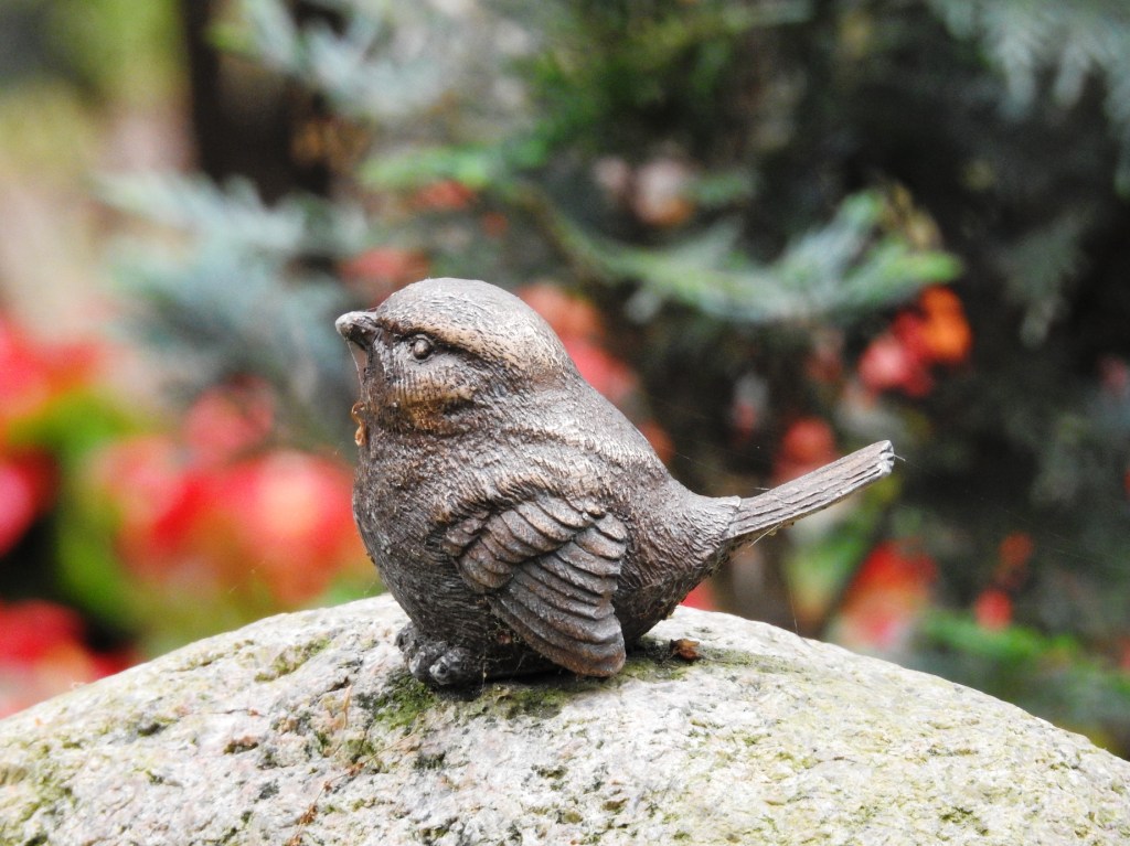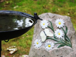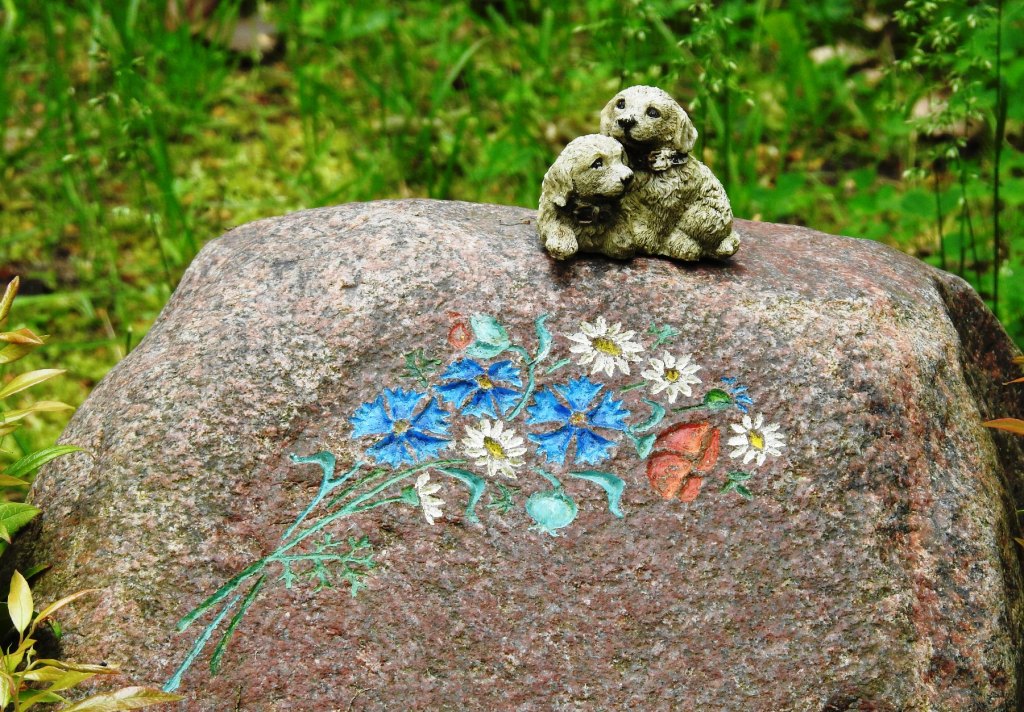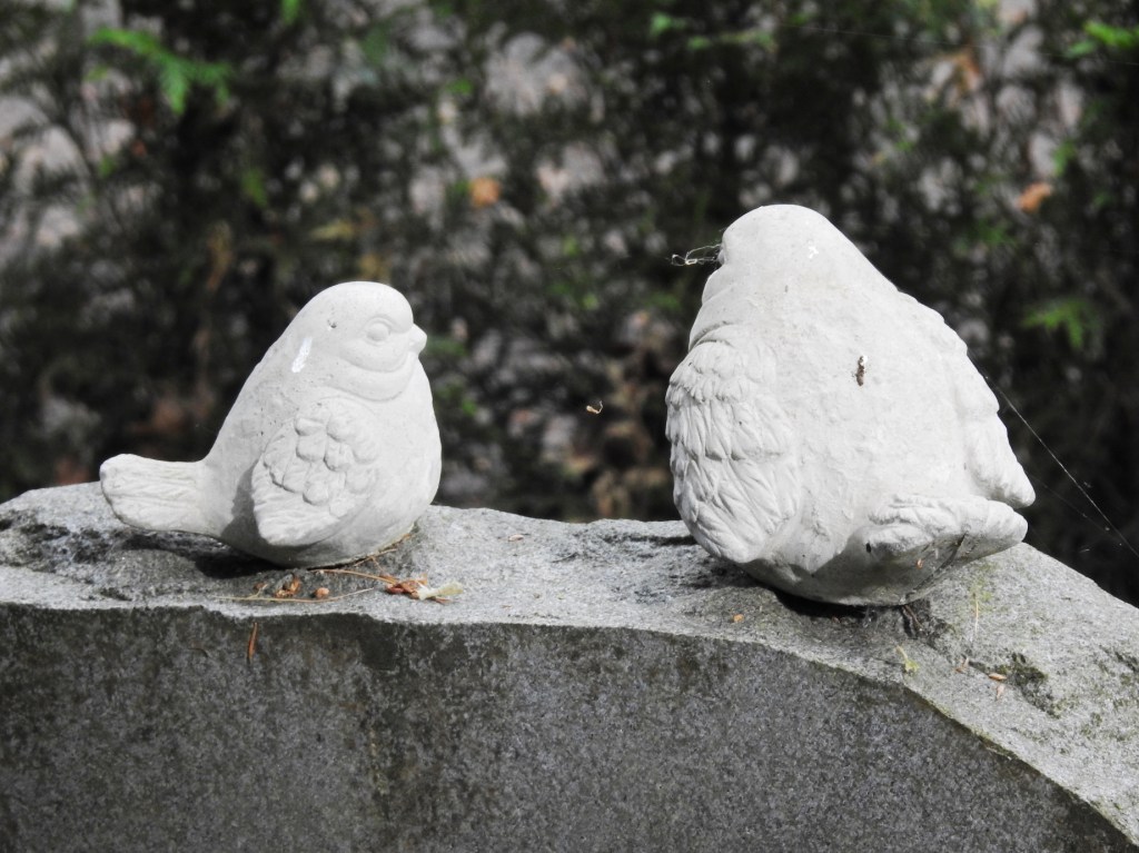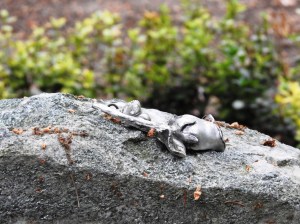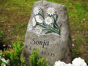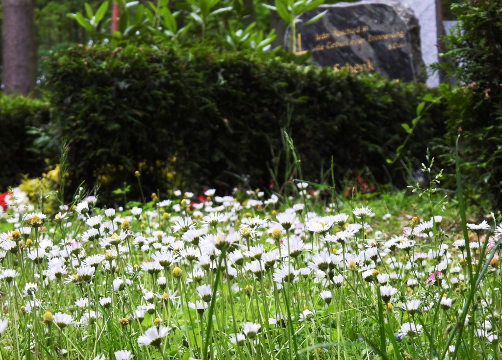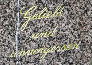 Maybe those pictures tell you, what I like, when it comes to gravestones: Keep it short and simple. I really liked the gray block just giving the name and lifespan of a certain Peter Apfelbaum (Peter Appletree, that reads in English). Nice name, nice way to be remembered, well done Peter! Or else, not even giving names or other details of the deceased, just the simple three words “geliebt und unvergessen” (loved and unforgotten). And I like Sonja’s grave, too – there is a little bird bath right in front of carved daisies. Same goes for the gree nstone of “Tante Margret 1922 – 2000”, which is Aunty Margret. I also liked the completely forgotten, wild grave, nothing left but a big fern, some weeds and a small nameplate put there by the authorities. Beside another tag reminding the family to tidy up (not on the pic) – this is Germany, after all -we have to have order here!