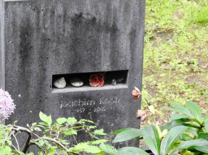 But now back to the more eerie choises to be made in the memorial business… like this certain Andreas Schulz. I don’t know, whether the deceased just loved his car so much or he just took against a wall in it. I checked the internet – he was neither a well known car designer nor a public figure at HDK (Hochschule der Künste = university of arts in Berlin), but led a logistic center at the Charité hospital in Berlin. All I know is, that Mr. Schulz or his family saw fit to put this stone atop his grave, crowned by a plastic case with a Porsche matchbox model car in it: