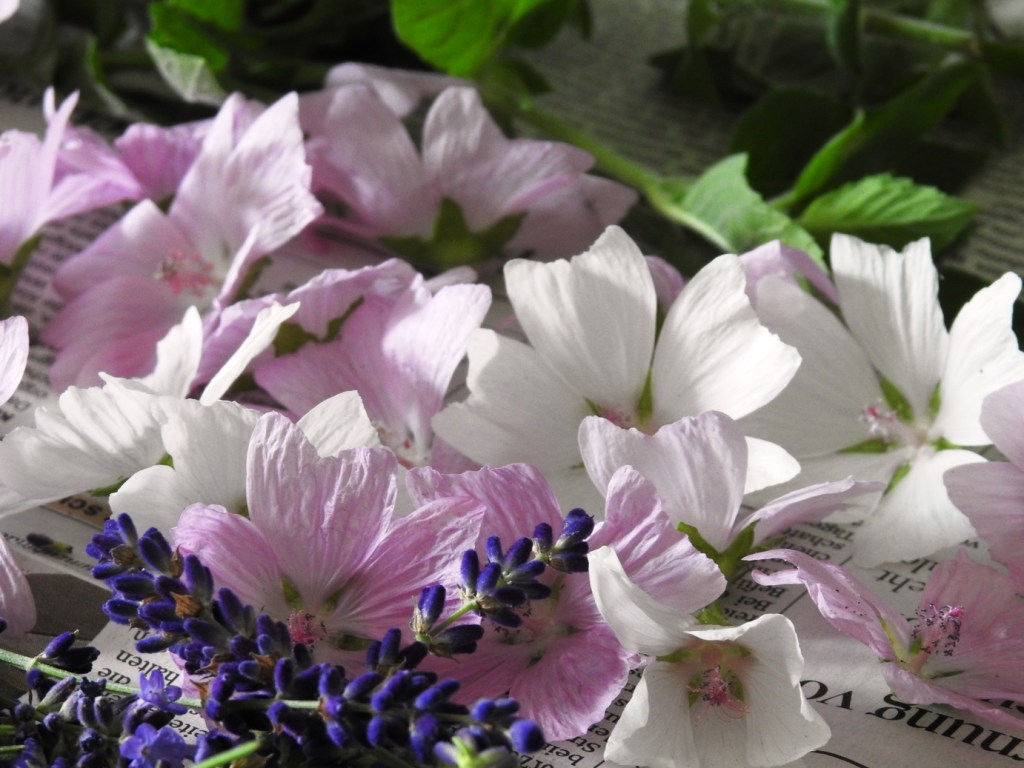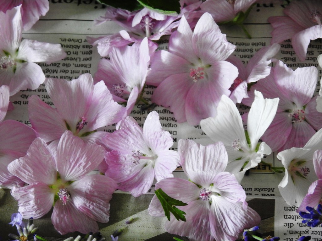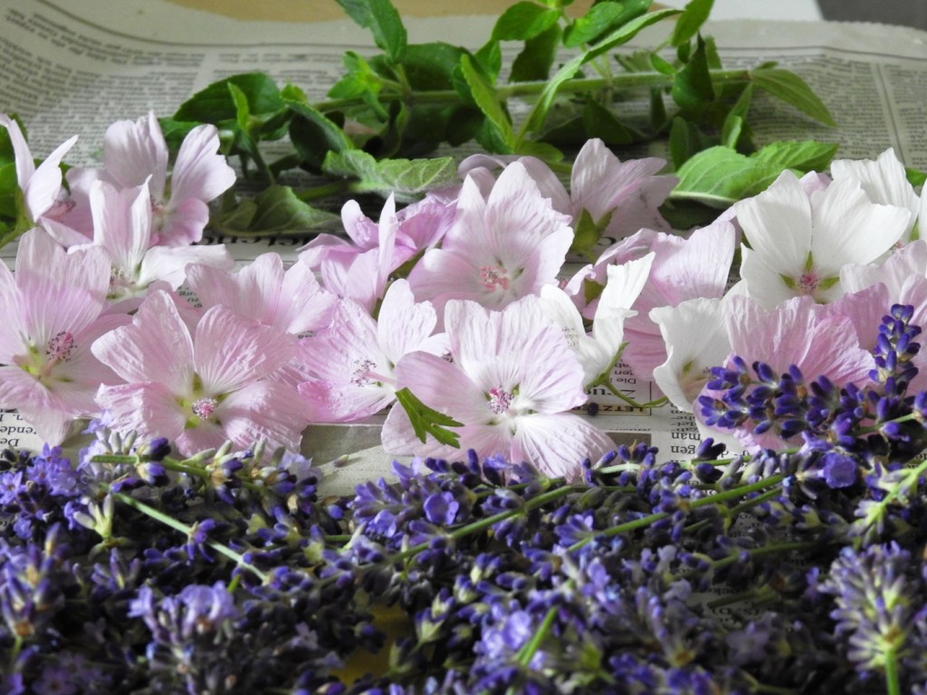 Summer is here – time to heap in the first harvest of herbs. For potatoes and meats it is rosemary and marjoram. For my everyday beverage, which is herbal teas in wild combinations, it is lavernder, mint and mallows. The kitchen table and sideboard once again take stage as drying stations for the next couple of days.