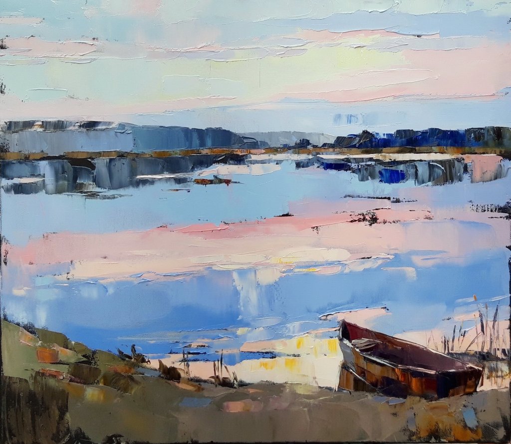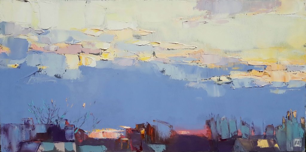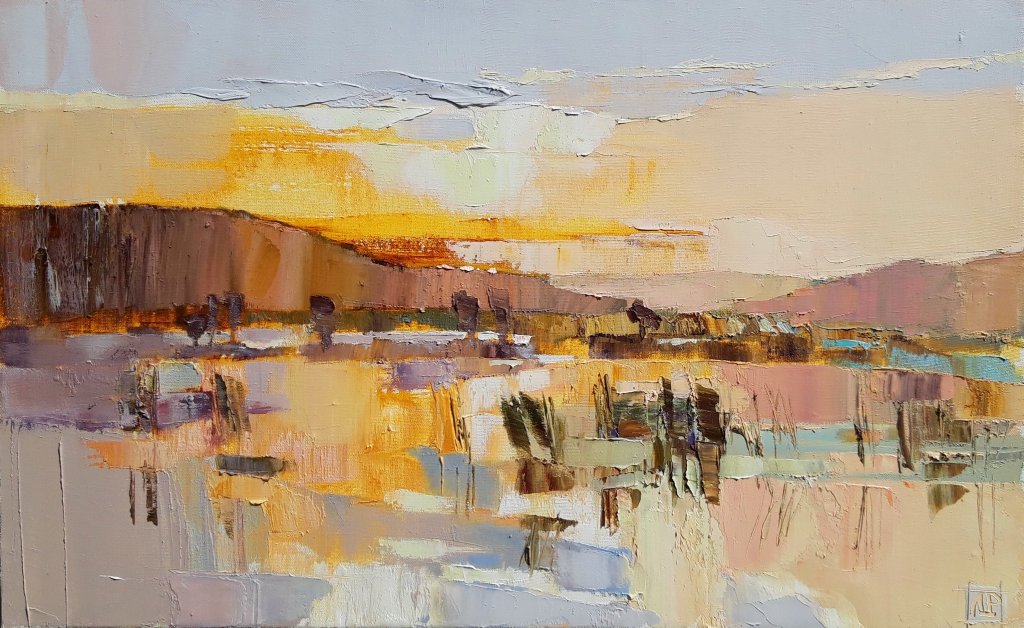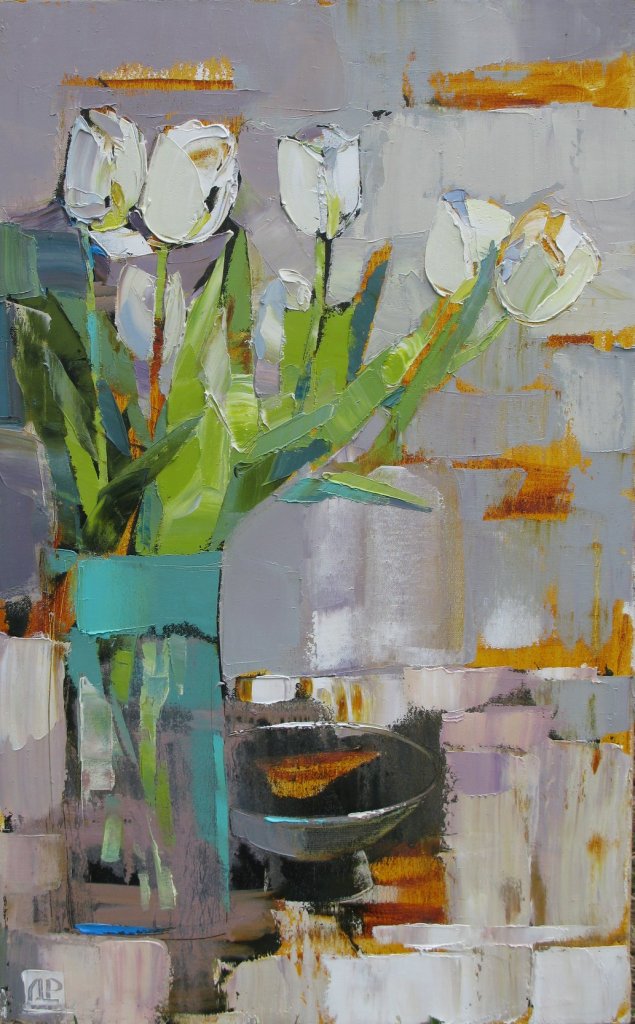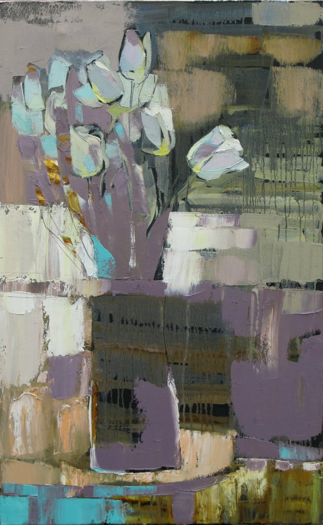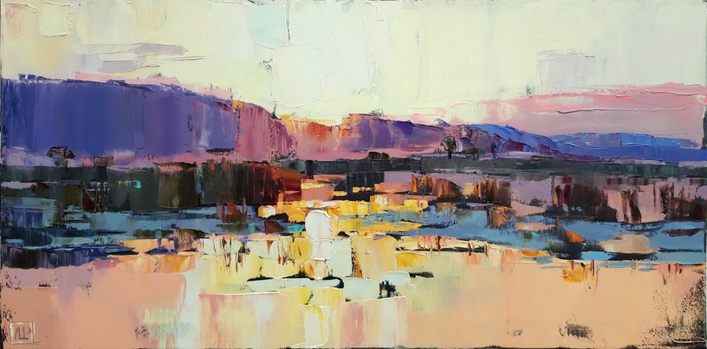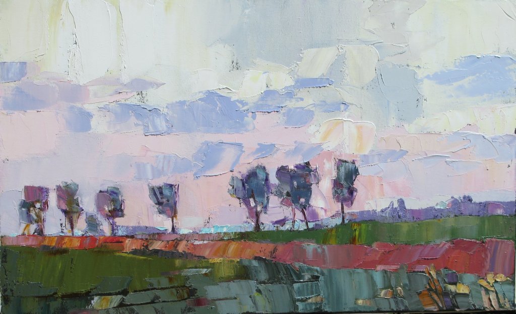 But back to this post and Mrs. Ros. She has a distinguished style. What looks just like various spaces of colour on first glances pieces itself together to form, what the artist intents to depict: a landscape, plant or manmade place. She uses bold strokes of brush and pallet knife to capture her view of the world. I like it a lot. Hope, you do, too.