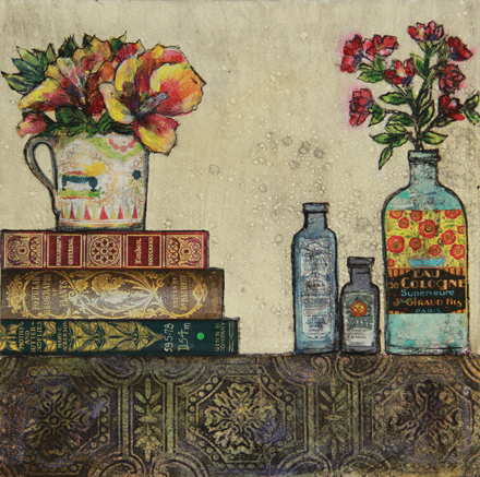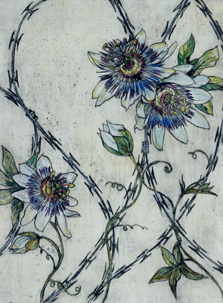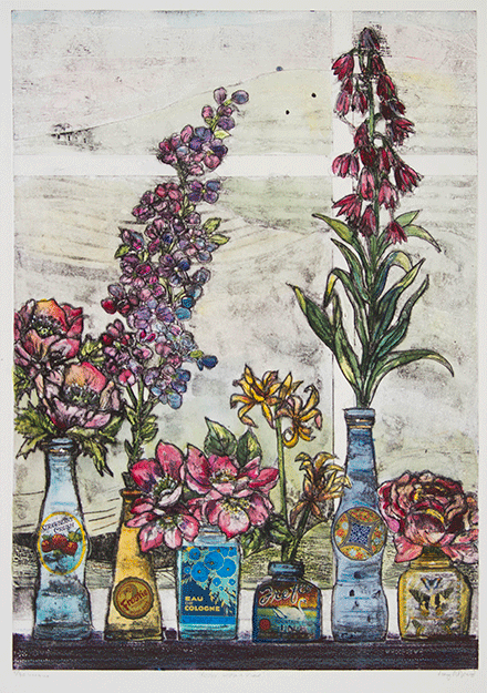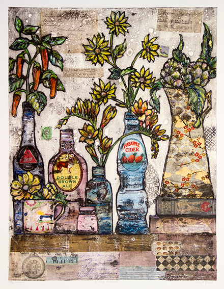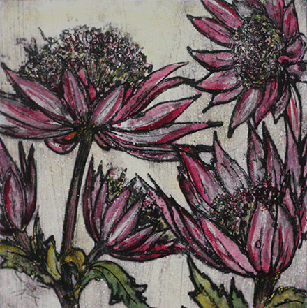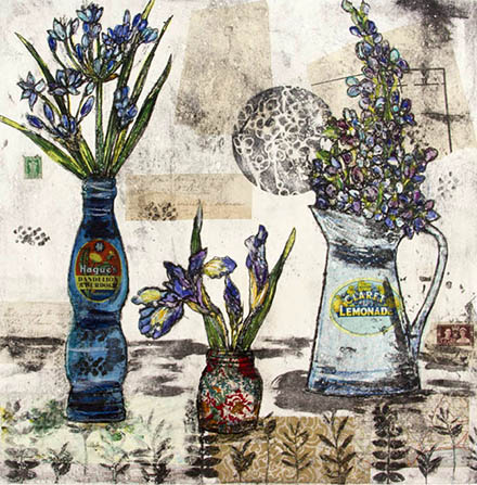 I still struggle to understand, how she makes these utterly lovely images, so I resolve to just quuote her own explanation: “The prints are taken from plates which have been collaged with a variety of materials, card, fabric, paper, string, sand and anything else that may come to hand; it’s recycling at it’s most creative! The plates are then sealed and then inked up and printed in intaglio or relief on damp paper using an etching press. The embossed textural quality of the print is unique to this method.”