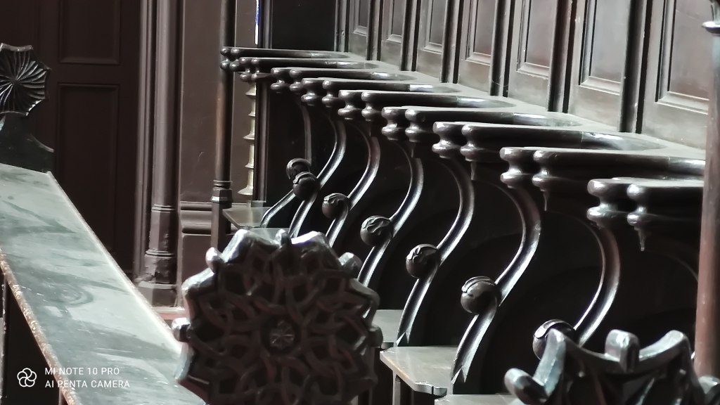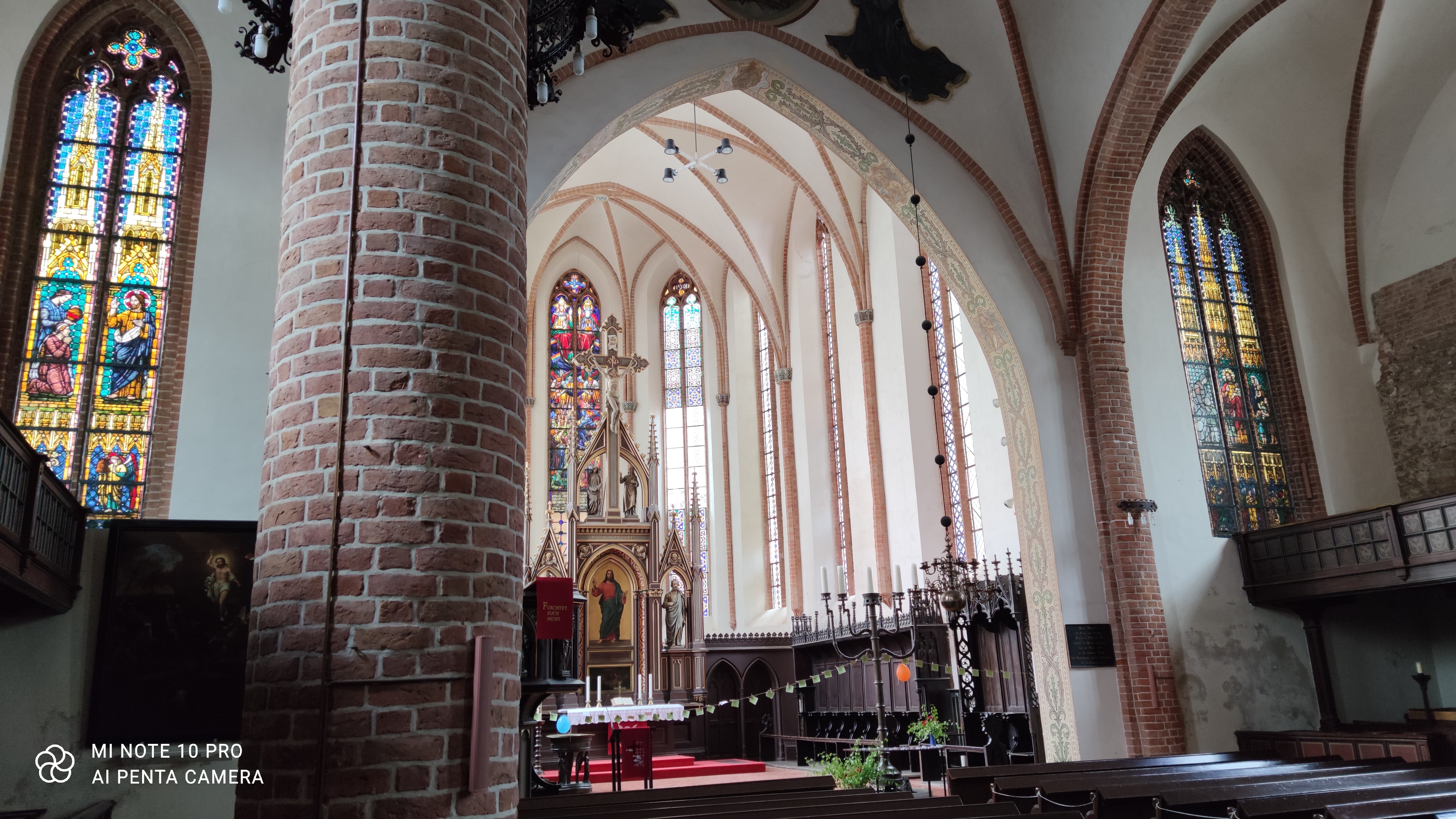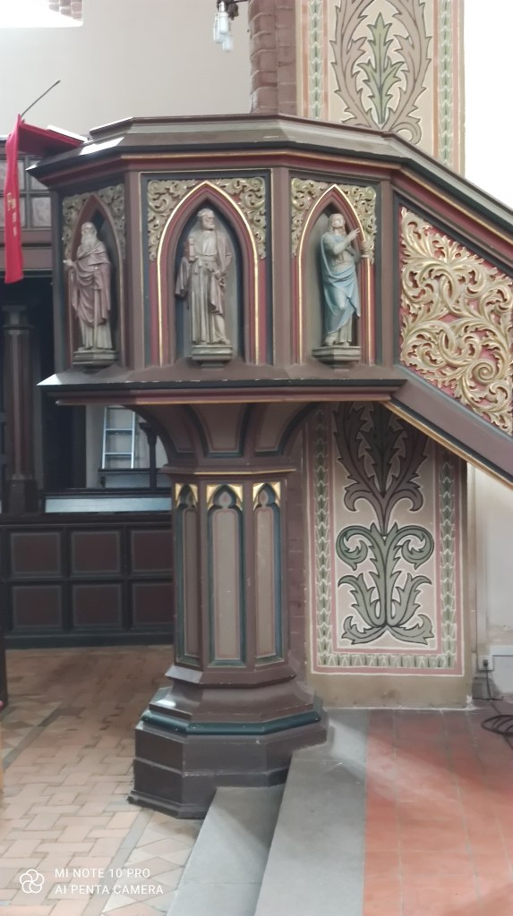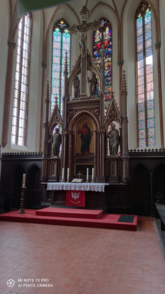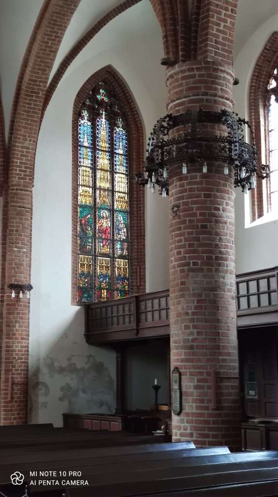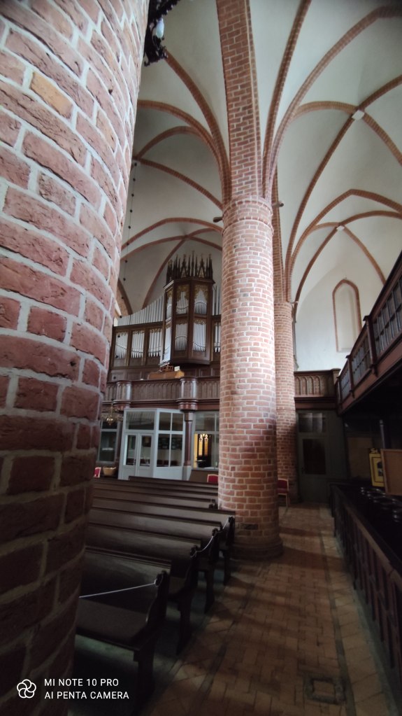 The red brick church – the gothic St. Jacobikirche – was first build in 1294. The interior is simple and very Protestant: quite sober. Being Austrian and therefor used to the Catholic baroque, very golden pomp and circumstance, I am still surprised to see those barren houses of prayer. I liked the nice wooden carving around the altar, though.