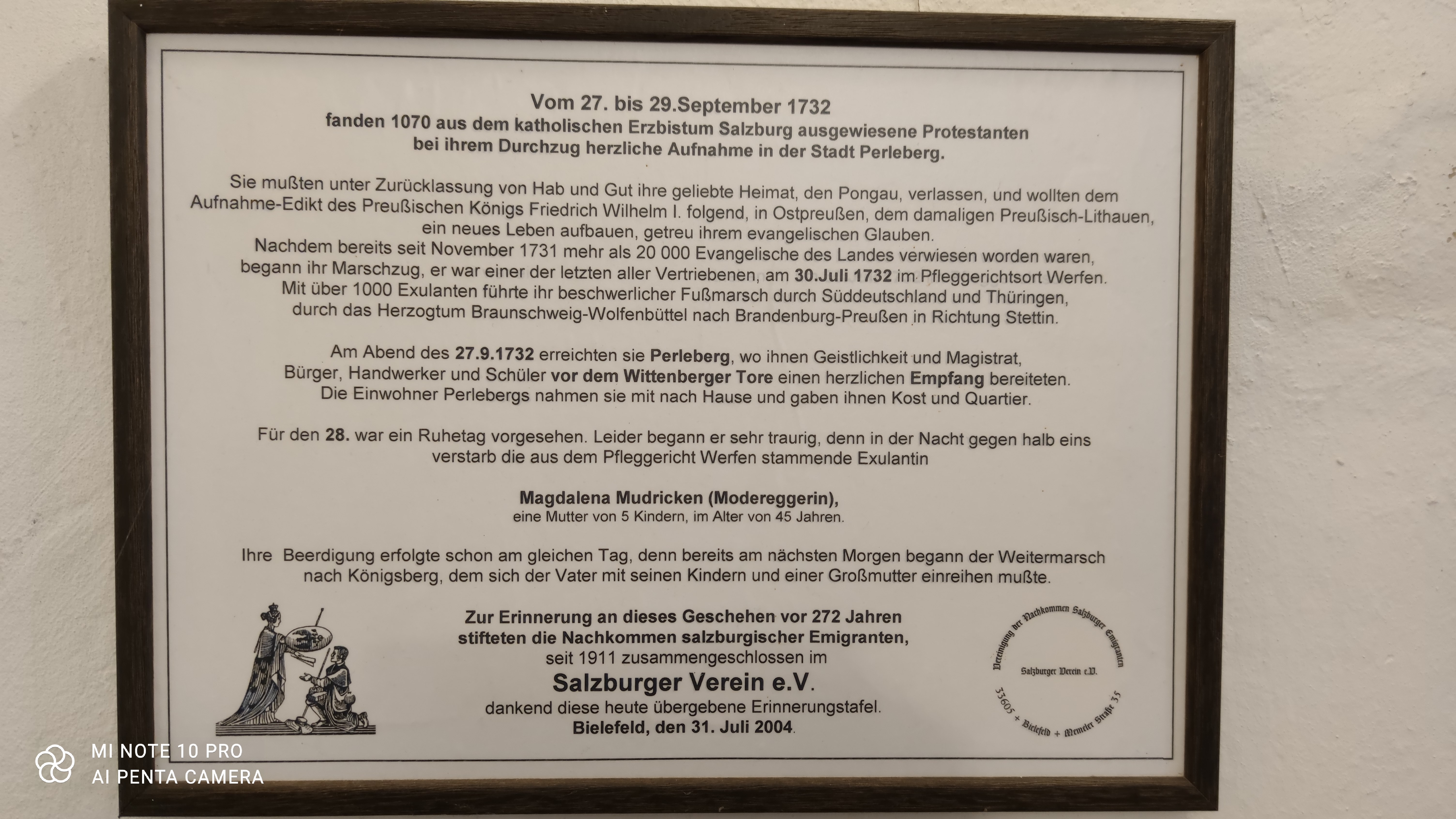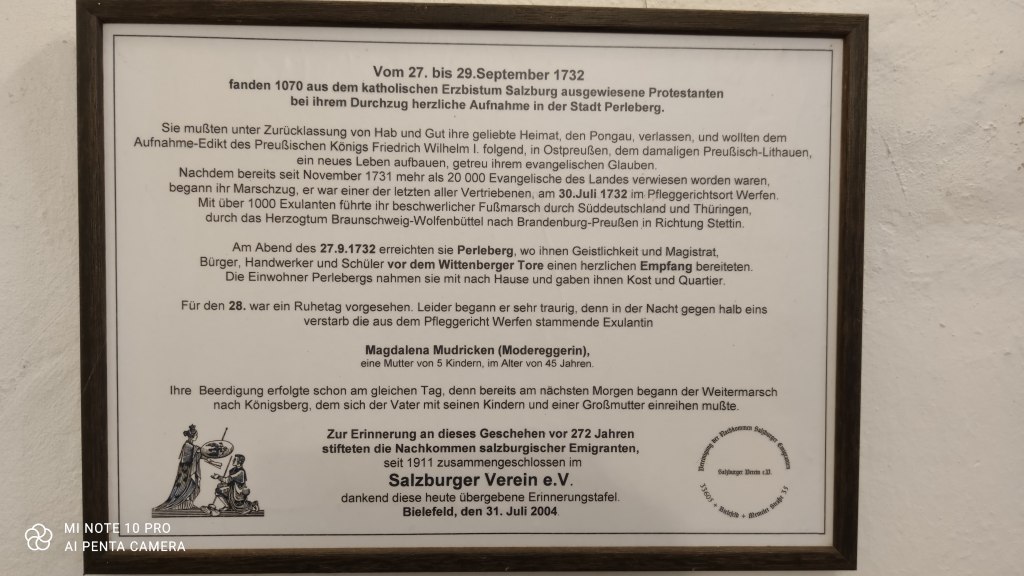 It tells a moving story and of a tragedy: A trek of more than thousand emigrant Austrian protestants – having been banished from their homes in Pongau by the Catholic Archbishop of Salzburg – made their way through Perleberg from Sptember 27th – 29th, 1732. They were part of over 20 000 protestants fleeing Austria, being the last leg, leaving in Austria on July 30th. Took them two months to walk the over thousand kilometers by foot. The citizens of Perleberg welcomed their guests, housed and fed them, holding a public holiday on the 28th. Which was overcast by the death of a certain Magdalena Mudricken, mother of 5, who died the previous night. She was buried on the same day, as her husband with the kids and grandmother had to join the trek the next morning on their way to Königsberg. The panel was given to the town of Perleberg from the desendants of said exiles in 2004 to thank the community for their help.