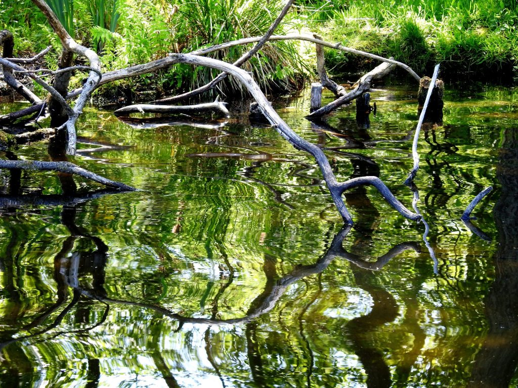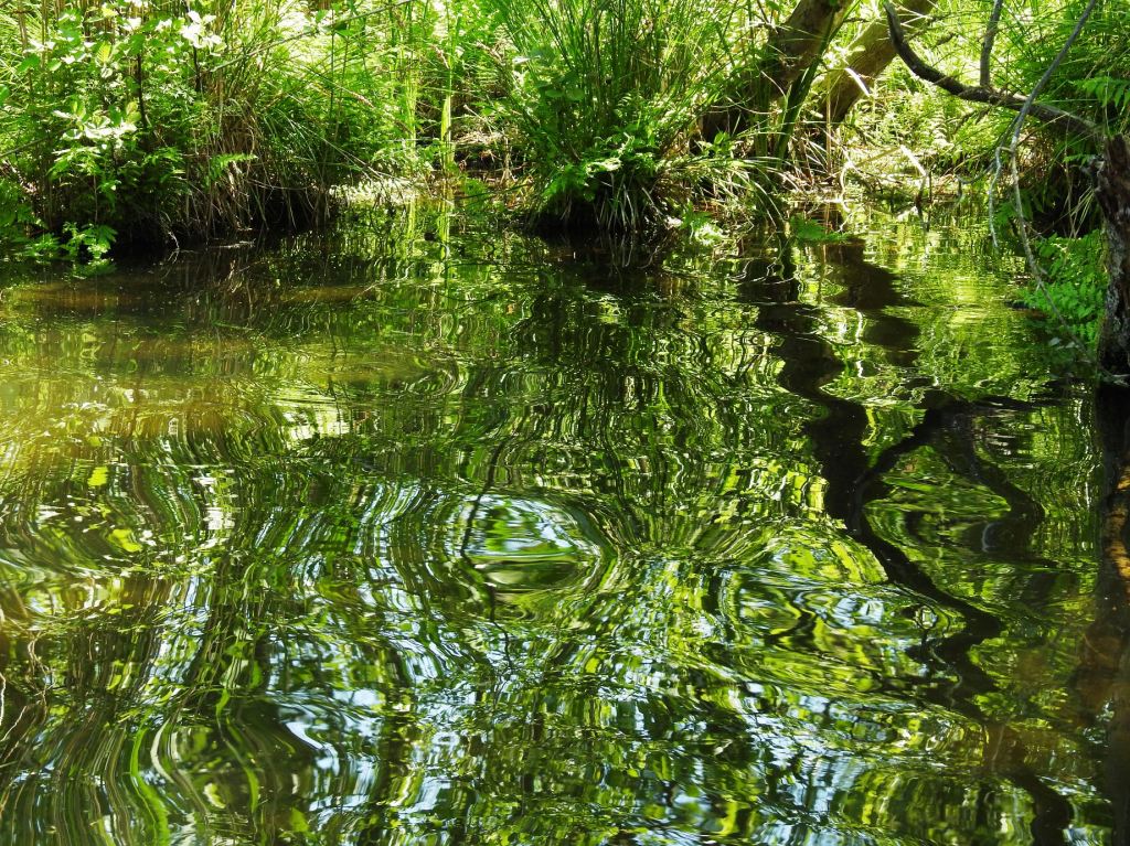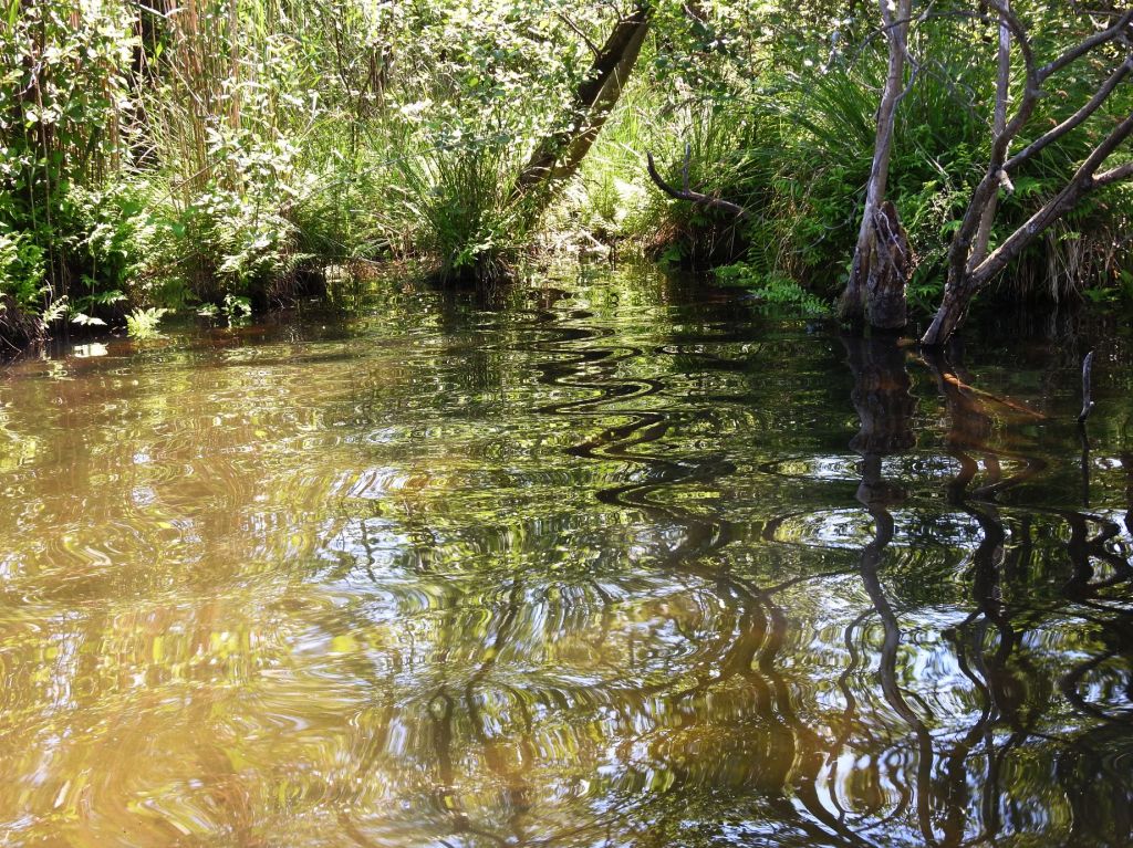 Rowing out into the blue, until we hit the outlet of the lake, a green gem of a rivulet.