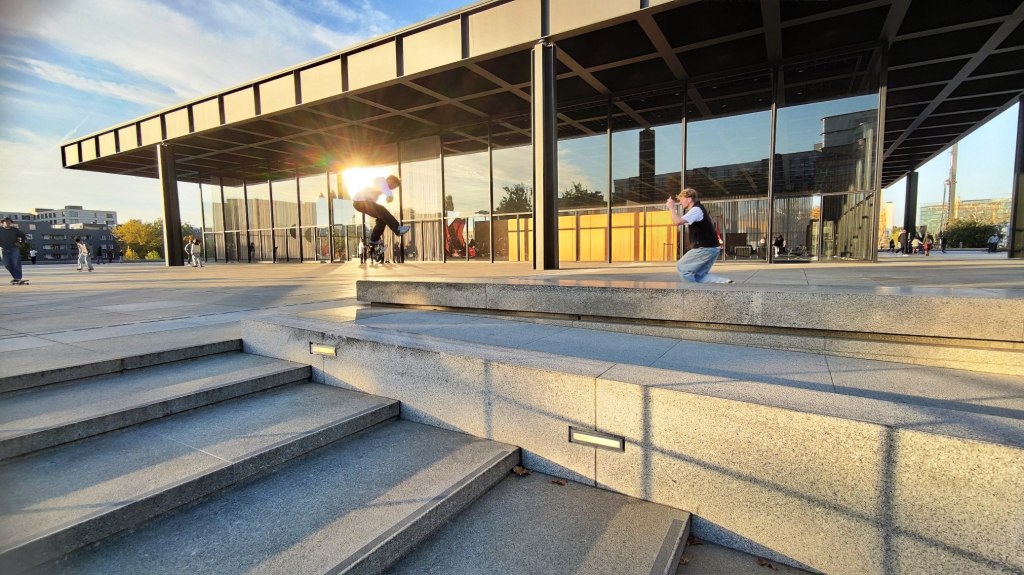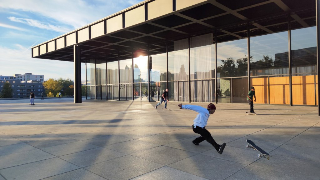 The actual reopening took place end of August this year, but I saw it now for the first time. And it made me happy. As it wasn’t possible to see the inside fully, except for a short peak inside the guard allowed me to have (there are still limitations in place due to Covid19), we circled the outside a few times. The big stone plateau around the house is used by young folks practising their skate boarding skills. And countless other folks, just like sweetheart and I, welcoming this sight back to ever changing Berlin.