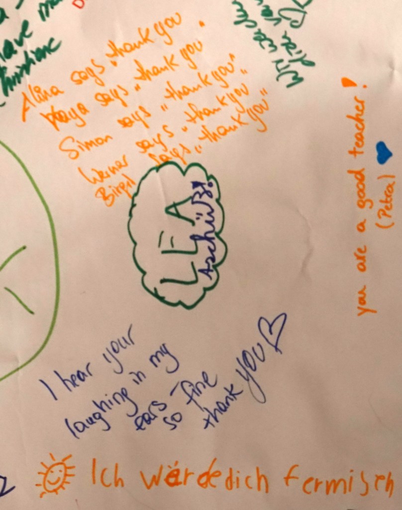 To get back to my point: A few days ago, I unexpectedly found an old snap shot of you setting the table. Seems, the pic wasn’t worthy of a spot in the album then, so I just used it as a bookmark. Thumbing through the book, it fell out. All of a sudden, I caught myself smiling at the memories it evoked. We had so much fun that particular evening. You visited here in Berlin, we had just spent the afternoon doing nothing in particular. The obligatory game of Scrabble, lots of jabbering. Sweetheart in the kitchen stewing up some dinner, you setting the table. Everbody looking forward to the evening’s entertainment ahead. What a blissful day! How lucky I am, to have shared it with you. This ponderings were followed by a wave of gratitude. Just like the messages, the firstgraders at your school made your colleagues write on their farewell – poster for you (clipping shown) :